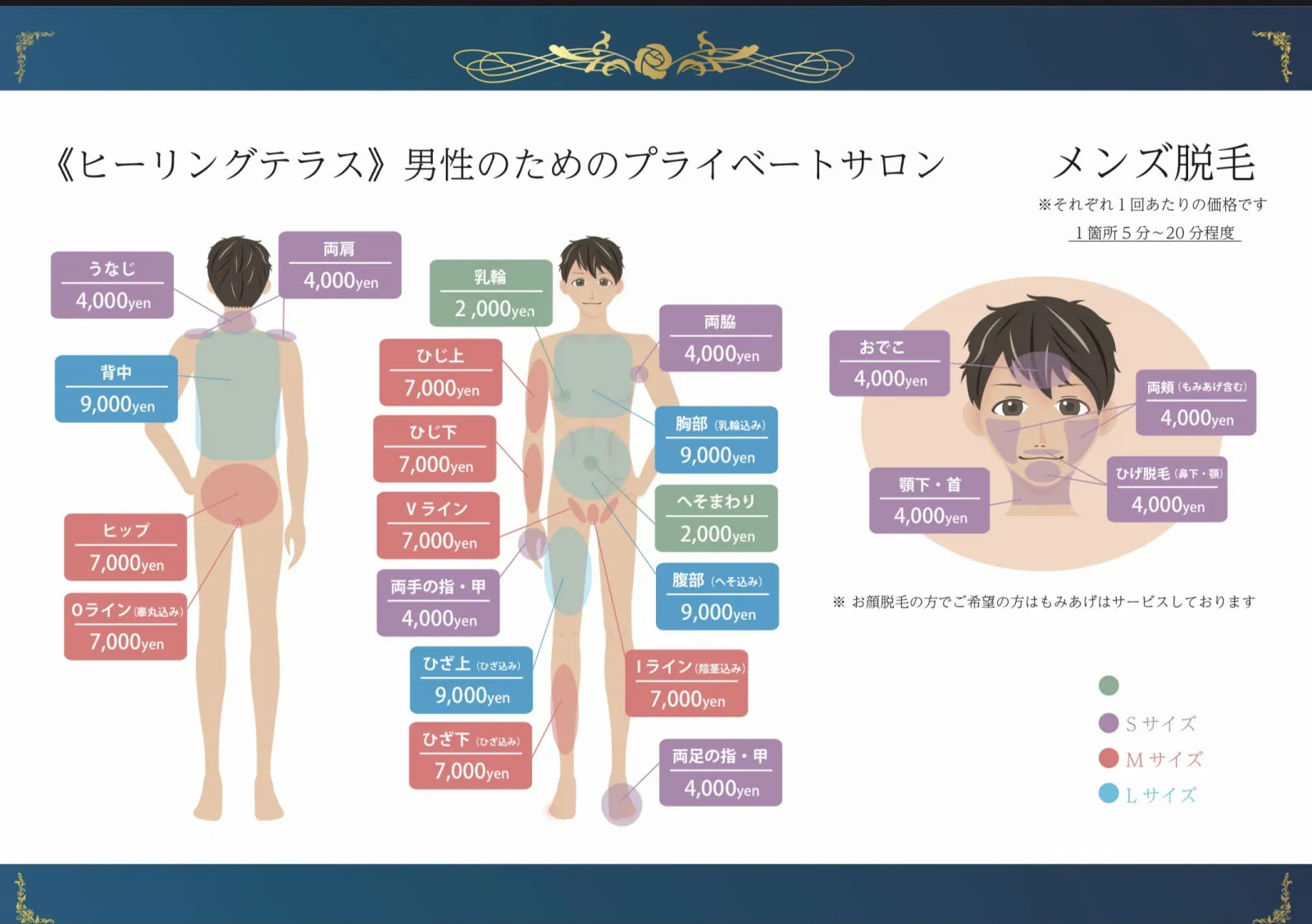 リラクゼーションやヘッドスパ、メンズ脱毛といった幅広いメニューをご用意し、