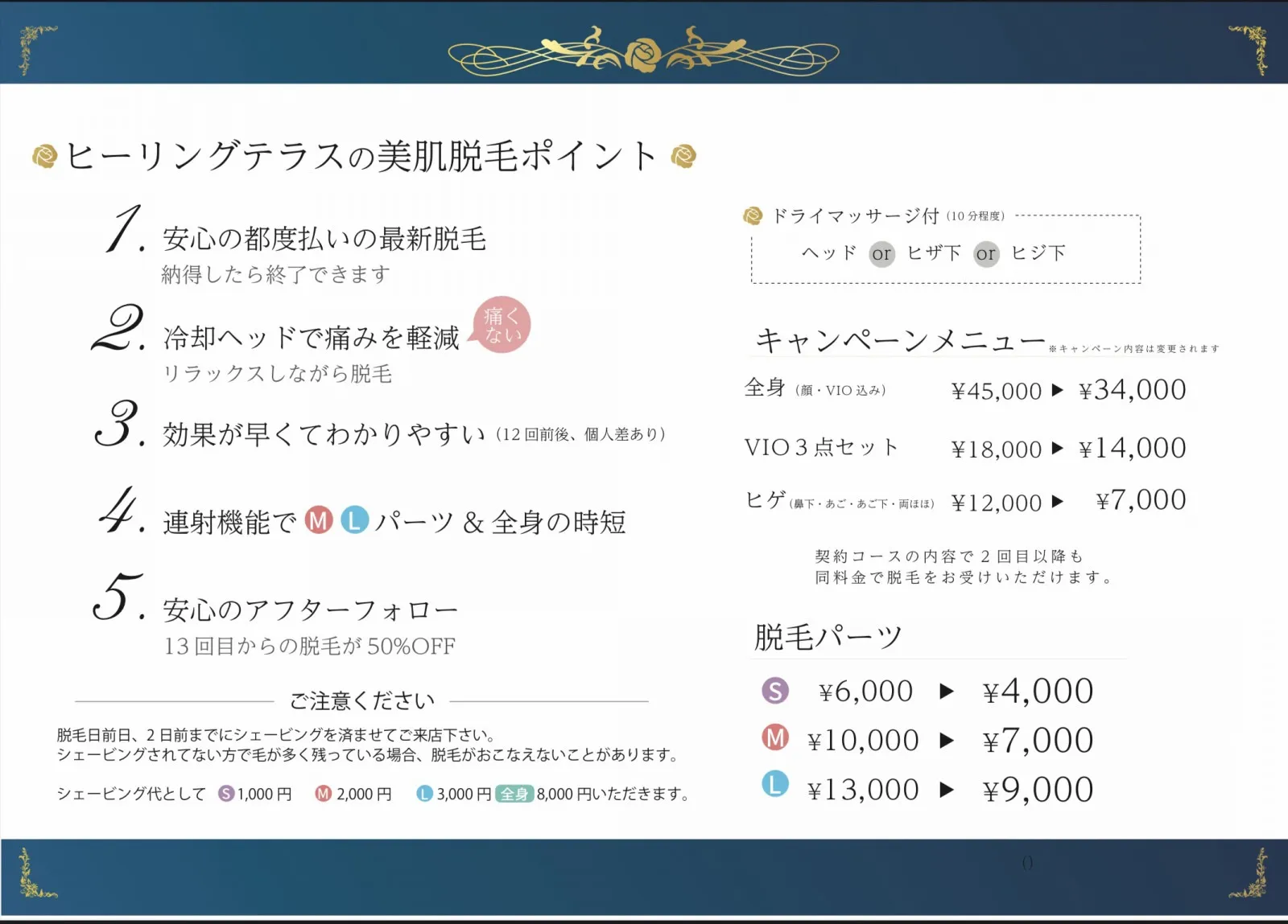 身体のメンテナンスを行うエステやスポーツリンパ、さらには技術を学べるリンパ講座まで、メンズ脱毛をはじめ、幅広いメニューをご用意いたしました。身だしなみを整えたい方から、日々の重荷の緩和を図りたい方、専門的な知識を身につけたい方まで、目的に合わせたプランを選択していただくことが可能です。料金体系を明確にし、納得した上でご利用いただけるよう努めています。